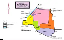 According to map Rawla mandi or grampanchayat 8 PSD-B consists 5 Chaks or land pieces.ward no 11 and 10 are not parts of these chaks. These wards are on chak 6 PSD C,which is a part of grampanchayat 9 PSD A. It consists 56 Bighas land. In 1996 deliberately or by mistake this 56 bighas land as ward no.10 and 11 were incorporated into Rawla Mandi.[12] Almost after 10 years Gram panchayat 9 PSD-A demanded back these areas on the basis of fact that these were originally inhabited on the land of grampanchayat 9 PSA-A. However this matter in now in court. On Aug-Sept 2013 both sarpanches of Rawla mandi and 9 PSD-A with their supporters kept dharna before police station with different hues of problem of these wards.Rawla mandi sarpanch was demanding not to commence any action in these wards,where as sarpanch of 9 PSD-A stated that he has full right to start action against encroachment and issues pattas in these parts.[12] After written assurance of BDO to demands of Rawla sarpanch dharna was put to end by Rawla mandi sarpanch.[12] On 12 September 2013 by a letter by Panchayat Raj department of Rajasthan government it was made clear that land concerning wards 10 and 11 was under administration of gram panchayat 9 PSD-A and 9 PSD A grampanchayat was free to initiate any action against encroachment and issue pattas in these wards.