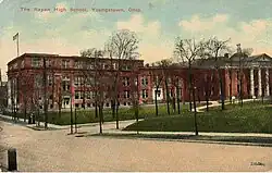 The original school building, which still stands at 120 W Wood Street, was built in the Greek Revival style. The building's appearance has changed little since its construction in the 19th century, and it is currently listed on the National Register of Historic Places.[1] In response to expanding enrollment, a larger physical plant was erected on the upper North Side of Youngstown in 1922 at 250 Benita Ave.[2] The original building served concurrently as an elementary school and a school of engineering for Youngstown College before its purchase by Youngstown City School District.