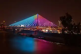 The bridge was inaugurated on November 7, 2006, and cost S/. two and a half million (US$ 780,000).[1][2] Then, a lighting system was installed, consisting of nearly 7,000 LED lights, placed on the 1,500 m of cable-stayed structures that support the bridge, at a cost of S/. 381,000.[3]