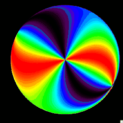 Click on the adjacent image to view an animation that represents the degree of polarization as shown on the celestial sphere. Black represents areas where the degree of polarization is zero, whereas red represents areas where the degree of polarization is much larger. It is approximately 80%, which is a realistic maximum for the clear Rayleigh sky during day time. The video thus begins when the sun is slightly above the horizon and at an azimuth of 120°. The sky is highly polarized in the effective North-Zenith-South plane. This is slightly offset because the sun's azimuth is not due East. The sun moves across the sky with clear circular polarization patterns surrounding it. When the Sun is located at the zenith the polarization is independent of azimuth and decreases with rising altitude (as it approaches the sun). The pattern then continues as the sun approaches the horizon once again for sunset. The video ends with the sun below the horizon.