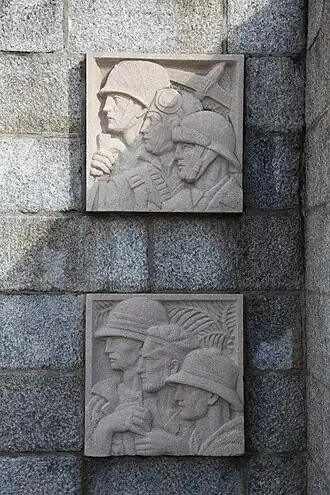 When completed the new memorial involved a base made from reinforced concrete from which rises a 20-metre-high pedestal, and on either side of this pedestal, a wall carries four bas-reliefs by Delamarre. The first of these depicts French soldiers of 1870 vintage wearing the uniforms of the time. A marine carries a rifle and wears the distinctive "pompom" beret, whilst the infantryman wears a képi and the cavalryman a cuirassier's helmet and holds a sabre. In the second bas-relief we have soldiers of the 1914–18 war. The infantryman who would have fought at the beginning of the war wears the képi but by his side we see the infantryman who would have fought later in the war; he now wears a helmet and holds a grenade in his hand. Bas-relief three shows two colonial soldiers wearing their distinctive hats and acknowledging the contribution they made and between them the soldier depicted wears the sort of beret one would associate with SAS parachutists/commandos. It was French parachutists of the 4th SAS regiment who were parachuted into Brittany on the nights of the 5 and 6 June 1944. The final and fourth bas-relief depicts the soldiers of 1939–45. An infantryman wears a US helmet, a pilot wears a flying helmet, goggles and parachute harness and a member of the armoured forced wears the helmet worn by such soldiers.[50][51][52][53]