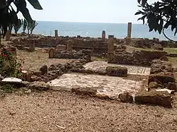 The Roman villa was first discovered in 1907 consisting of two rooms with elaborate opus sectile in expensive coloured marbles and three rooms with mosaic floors dating from the 1st c. AD.
