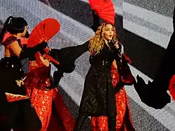 The tour's main stage was elevated and set up at the end of each arena. A long catwalk extended from the middle into the audience ending in a heart-shaped stage. The catwalk was bisected by an arena-wide cross stage.[144] Designers working on the tour's wardrobe included: Jeremy Scott for Moschino, Alessandro Michele for Gucci and Alexander Wang, along with Fausto Puglisi, Prada, Miu Miu, Swarovski, Lebanese designer Nicolas Jebran, as well as Madonna's longtime collaborator Arianne Phillips.[145] The tour generated positive critical reviews, many noting that Madonna appeared to be in a happy mood onstage.[146][147] It grossed a total of $169.8 million from 82 shows, with over 1.045 million ticket sales.[148] A live album of the tour was released on September 15, 2017, as DVD, Blu-ray and digital download.[149]