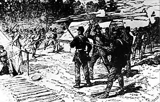 The rebel yell was a battle cry used by Confederate soldiers during the American Civil War. Confederate soldiers used the yell when charging to intimidate the enemy and boost their own morale, although the yell had many other uses. There are audio clips and film footage of veterans performing the yell many years later at Civil War veterans' reunions.[1] The origin of the yell is uncertain.