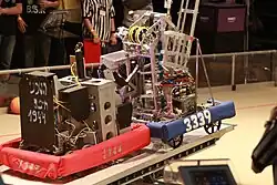 The field is a carpeted area 27 feet by 54 feet[11] designed to mimic a basketball court.[12] At both ends are the driver stations and an array of basketball hoops.[11] There is one low hoop, two middle hoops, and one high hoop.[11] Across the narrow dimension of the field a 4 inch high wall, along which are placed three tilting bridges at a height of 12 inches.[11] The bridges at the edges are color-coded for each alliance, and the center bridge, called the Coopertition bridge, is available for both alliances.[11]