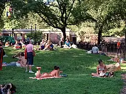 Many recreational activities are organized, typically by public institutions, voluntary group-work agencies, private groups supported by membership fees, and commercial enterprises.[24] Examples of each of these are the National Park Service, the YMCA, the Kiwanis, and Walt Disney World. Public space such as parks and beaches are essential venues for many recreational activities and Tourism has recognized that many visitors are specifically attracted by recreational offerings.[25] In particular, beach and waterfront promenades such as the beach area of Venice Beach in California, the Promenade de la Croisette in Cannes, the Promenade des Anglais in Nice or the lungomare of Barcola with Miramare Castle in Trieste are important recreational areas for the city population on the one hand and on the other also important tourist destinations with all advantages and disadvantages for the locals.