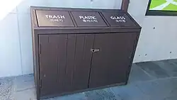 South Korean waste disposal policy (known as "jongnyangje") operates under the Ministry of Environment. Waste is required to be separated into four parts: landfill waste, organic waste, recyclable waste, and large waste items. Recyclable waste such as: paper, plastics and glass, should be separated before disposal. Fines are applicable to violations of the policy.[1]