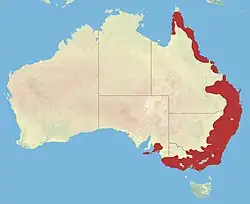 The finch is common in the south east of its range, from Brisbane to Melbourne. Subspecies N. t. minor is common between Cooktown and Townsville.[2] The species is listed as being of least concern on the IUCN Red List.[1][6] There are no key threatening processes for N. temporalis, although the Pest Animal Control CRC suggests that the introduced nutmeg mannikin (Lonchura punctulata), which currently threatens some native mannikins through increased competition, maybe a minor threat to N. lateralis in northern Queensland.[7]