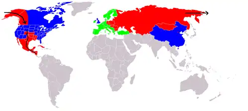 Blue: The United States and its allies Canada, the United Kingdom and China.