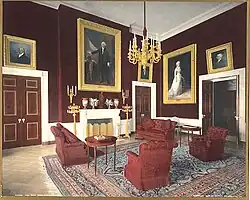 Boudin oversaw the installation of art in the Red Room as well. Boudin preferred a French design aesthetic,[18] which emphasized covering as much wall space as possible with paintings. This scheme was implemented early in 1961, but in early 1962 (after the walls were recovered in silk) Boudin altered this scheme. He now created two rows of paintings, one at eye-level and one above the top of the door frames. This mimicked the look of an art gallery, and was used in many French country manor-houses.[8]