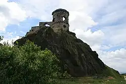 The site of Mow Cop is not particularly isolated as there is a village around the hilltop. The nearby A34 is a former Roman road. The Mow Cop Castle folly was built in 1754 to look like a ruined castle.[12]