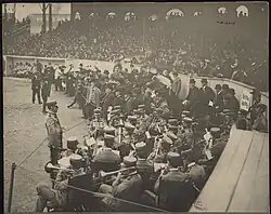 In April 1904, the team was purchased by John I. Taylor of Boston.[37][38] The 1904 team found itself in a pennant race against the New York Highlanders.[39] A predecessor to what became a storied rivalry, this race featured the trade of Patsy Dougherty to the Highlanders for Bob Unglaub.[40] In order to win the pennant, the Highlanders needed to win both games of their final doubleheader with the Americans at the Highlanders' home stadium, Hilltop Park.[41] With Jack Chesbro on the mound, and the score tied 2–2 with a man on third in the top of the ninth, a spitball got away from Chesbro and Lou Criger scored the go-ahead run and the Americans won their second pennant.[42] However, the NL champion New York Giants declined to play any postseason series, but a sharp public reaction led the two leagues to make the World Series a permanent championship, starting in 1905.[43][44][45]