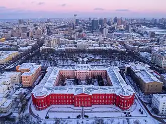 The Red University Building (Ukrainian: Червоний корпус Київського університету, romanized: Chervonyi korpus Kyivskoho universytetu) is the principal and oldest 4-story building of the Kyiv University located at 60 Volodymyrska Street, in Kyiv, the capital of Ukraine. This building is a famous symbol of the Kyiv University and the Ukrainian fundamental higher educational system.