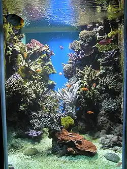 A reef aquarium or reef tank is a marine aquarium that prominently displays live corals and other marine invertebrates as well as fish that play a role in maintaining the tropical coral reef environment. A reef aquarium requires appropriately intense lighting, turbulent water movement, and more stable water chemistry than fish-only marine aquaria, and careful consideration is given to which reef animals are appropriate and compatible with each other.