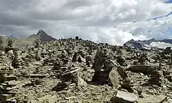 The Col du Carro (altitude: 3,149 m) allows the passage between Italy and France. Coming from Italy, the long-distance hiking trail (marked GR for "Grande Randonnée") crosses scree then becomes quite steep as you approach the Col du Carro. At the end of the final ascent of the via ferrata (Italian side), the hiker suddenly comes to a "forest of cairns" erected over the years and in perpetual growth.