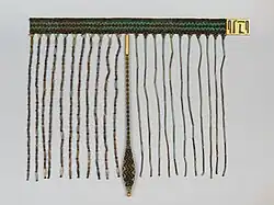 Nicknamed the "blue crown", the khepresh is a late headgear reserved exclusively for pharaohs. It appeared at the end of the Middle Kingdom, but only became common during the 18th and 19th dynasties, when the rulers were in battle.[12] The headdress is relatively tall, bulbous and studded with numerous small circular golden lozenges. For a long time, Egyptologists mistakenly considered this headdress to be an iron war helmet, as the ruler wore it quite frequently in battle scenes, during military parades or at certain religious celebrations such as the Min Festival. It is in fact a distinctive sign of the monarch, a mark of triumph, probably made of fabric or leather.[13]