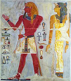 The sceptre-heqa is surely the oldest symbol of Pharaonic domination. It represents a shepherd's crook, a stick with a curved end.[28] The hook and its spread were designed to grasp an ovis or caprinae (ewe, goat) by the hind leg in order to administer care. The symbolism of the Pharaonic crook is simple to analyze. Reflecting the pastoral aspects of Egyptian society, the Pharaoh was the shepherd of his people, guiding and protecting them.[29] In hieroglyphic writing, the image of the crozier served as an ideogram for the concept of "power/authority/sovereignty", noting the words "regional governor" and "foreign sovereign".[30] The two oldest known examples came from the royal necropolis of Abydos (Cemetery U). The first is fragmentary and dates from the end of the Naqada II period, while the second is complete and dates from the end of the Predynastic period. The latter was found in tomb U-j, where a Thinite ruler was buried, possibly King Scorpion. The earliest representation of a pharaoh with a Heqa scepter in his hand is a small statuette bearing the name of Ninetjer (2nd Dynasty).[29] On the other hand, the same figure holds the nekhekh flail (or flagellum). Often misrepresented as a fly swatter, the nekhekh was actually used to prod cattle. It, too, was a symbolic object born of the Egyptian agricultural mentality, which was strongly influenced by the values of animal husbandry.[31] With the development of the Osirian cult from the 4th Dynasty onwards, the scepter-heqa and flail-nekhekh became attributes of Osiris; the funerary god holding both in his two hands and crossed over his chest. By assimilation with this important divinity, pharaohs were also depicted in this posture, notably on the Osiride pillars of their monuments of eternity and on their sarcophagi.[32]