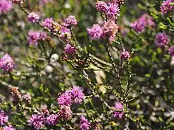 The flowers are deep pink to purple and arranged in small clusters on the ends of branches that continue to grow after flowering. There are 5 sepals, 5 petals and 5 bundles of stamens. Flowering occurs between August and November and is followed by fruit which are woody capsules.[2][3]