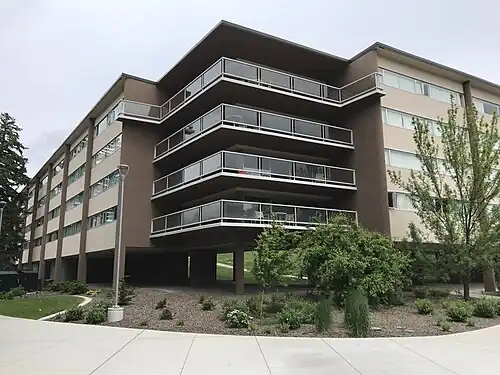 The Regents Hill residential complex, also known as Regents Hall, is a residence hall located on the main campus of Washington State University in Pullman, Washington. Designed by Paul Thiry and completed in 1952, it was the first International Style building on the Washington State University campus. It is one of the many dormitories on the Washington State University campus available to undergraduates. Variously called "Regents Hall" and the "Regents Hill Halls," the complex (originally named the "New Women's Dormitory" and officially renamed the "Regents Hill Dormitories" on December 4, 1951), consists of two, four-story linked residential wings, McGregor Hall and Barnard Hall, and Stearns Hall—a free-standing dining hall and common space. Together with Scott Coman Hall just to its northwest (completed in 1958), the complex ushered in a new era of campus design featuring large, technologically sophisticated, light-filled concrete buildings for research, teaching, and residential life.