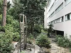 Regents Hill features the university's only Japanese-influenced garden. Tucked behind McGregor Hall on a slope, a small, informal landscape of trees, shrubs, moss, stone pathways, and a small pond suggests the architect's travels to Asia in 1934 and his awareness of the Japanese work of Czech-American architect Antonin Raymond. An open, metal sculpture, built with the original design, still stands and adds to the overall effect. Several large rocks are scattered loosely about the landscape, yet their seemingly random placement might have been intentional to reveal the connections between eastern and western cultures; broadly suggestive of Washington state's geography on the Pacific Rim. The design's relationship to the landscape as a whole—from its sensitive relationship to the ground (by raising it up on stilts) to its expansive windows permitting views from its hilly site—earned it a place among Architectural Forum's five best college buildings in 1951.[7]