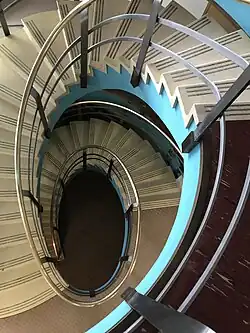 At the same time, Thiry's design attempted to link the building to local conditions: the lobby of Stearns Hall, for example, features a sculptural spiral staircase, curved walls, and a wavy, stainless steel banister; originally, Stearns included carpets and furniture that Thiry considered "emblematic of the Palouse country" because their wavy designs suggested the rolling hills of the surrounding landscape.[3] An alumni magazine celebrated McGregor Hall and Barnard Hall for their spacious, double rooms with picture windows and floors featuring kitchenettes, laundry units, and an outdoor lounge area (what later became known as the "sun porch") with "flower garden and lawn."[4] The magazine boasted of the building's common sewing and typing rooms and considered the design, overall, to mark a significant advance in campus housing because of its "home and small-group living."[5]