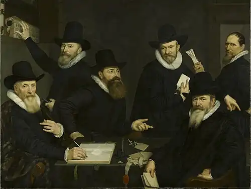 A regents group portrait (regentenstuk or regentessenstuk in Dutch, literally "regents' piece"), is a group portrait of the board of trustees, called regents or regentesses, of a charitable organization or guild. This type of group portrait was popular in Dutch Golden Age painting during the 17th century, and in the 18th century. They were intended to be hung in the regentenkamer, the regents' meeting room,[1] or another prominent location in the institution.