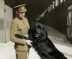 There are also examples of call outs for wallabies or kangaroos to be sent to training camps as mascots, and others were provided to battalions as gifts.[3] Some accounts of the acquisition of mascots indicate a rather ad-hoc approach. The Queenslander in December 1914 featured the newly adopted koala mascot of the Second Queensland Contingent Light Horse ('The bear was discovered during a route march to Sandgate, and one of the men climbed the tree and secured it. The koala was at once adopted by the regiment').[5] Some mascots were accidentally lost prior to embarkation such as the bulldog named Colonel Stone, of the 42nd Battalion, in April 1916.[3]