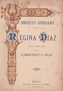 Regina Diaz was Giordano's second full-length opera and like its predecessor, Mala vita, was commissioned by the Milanese music publisher Edoardo Sonzogno. Mala vita had had considerable success apart from its performances in Naples where the gritty verismo story and depiction of Neapolitan slum-dwellers had caused a furor amongst the critics and audience alike. For his second opera, Sonzogno commissioned Giovanni Targioni-Tozzetti and Guido Menasci (the librettists of Mascagni's hugely successful Cavalleria rusticana) to write a libretto for Giordano. Sonzogno was candid with the librettists concerning the problems they might face with the composer.[2] He wrote to Menasci in 1892: