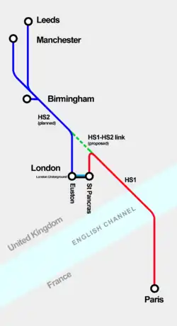 The proposed route of HS2 into London will bring the line very close to the existing HS1 line which terminates at St Pancras station; at their closest points, the two high-speed lines will be only 0.4 miles (0.64 km) apart, and the Department for Transport (DfT) examined various proposals for connecting HS1 and HS2. A governmental "command paper" published in March 2010 proposed either a rapid transit link between HS1 and HS2 terminals, or a direct railway connection.[18] Later announcements on 10 January 2012 suggested that the first phase of the HS2 project was to include the construction of a single track link across North London between HS2 and HS1, partially in tunnels and partially over the existing North London Line, allowing for three trains per hour in both directions.[19][20] DfT proposals in 2013 stated that this link would allow HS2 trains from the North of England to bypass London Euston and connect straight to HS1, enabling direct rail services to be run from Manchester, Leeds and Birmingham to Paris, Brussels and other continental European destinations.[15][21]