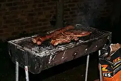 Braai is regarded by some as another word for barbecue, in that it serves as a verb when describing how food is cooked and a noun when describing the cooking equipment, such as a grill.[1] The traditions around a braai can be considerably different from a barbecue, even if the method of food preparation is very similar. While wood was formerly the most widely used braai fuel, in modern times the use of charcoal, briquettes and gas (gas braai) has increased due to their convenience, as with barbecues elsewhere in the world.[2] There has, however, been a renewed interest in the use of wood after the South African government started its invasive plant species removal programme.[3] Many households now own both a gas and wood or charcoal braai.[4] A portable charcoal or wood braai is called a braai stabd.
