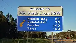 | North Coast | Mid North Coast | extends from Port Stephens at Hawks Nest to as far north as Woolgoolga, near Coffs Harbour. Coffs Harbour and Port Macquarie are small cities. |