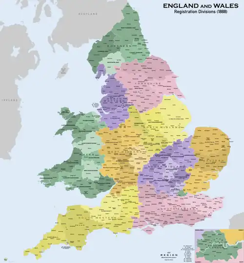 A registration district in the United Kingdom is a type of administrative region which exists for the purpose of civil registration of births, marriages, and deaths and civil partnerships.[1] It has also been used as the basis for the collation of census information.
