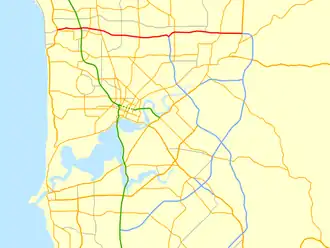 The highway was further extended with the section between Mirrabooka Avenue and Wanneroo Road, which opened on 17 November 1994.[2] The highway was finally made continuous on 6 September 1996 with the opening of the Erindale Road–Wanneroo Road segment.[2] A short time later, it was extended eastwards to West Swan Road. This section, which opened on 25 November 1996, provided a connection to Great Northern Highway and Roe Highway via Middle Swan Road, an existing local road.[2]