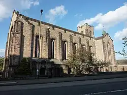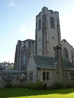 It consists of a cruciform with side aisles and a square tower to the south-east.[8] To the east of this main section is a cloister court, around which are arranged vestries, the session house, a hall and the church officer's house.[8] The windows along the side are decorated with tracery and there are flanking buttresses that travel above the height of the windows.[8] The three windows of the chancery are decorated with stained glass by James Ballantine, depicting the Nativity, Crucifixion and Ascension.[8][4]