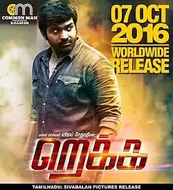 Rekka (transl. Wing) is a 2016 Indian Tamil-language action comedy film written and directed by Rathina Shiva. The film features Vijay Sethupathi, Lakshmi Menon and Sija Rose in the lead roles, while Sathish, K. S. Ravikumar and Sriranjani play supporting roles. The film is produced by B. Ganesh, who co-produced Orange Mittai. Featuring music composed by D. Imman and cinematography by Dinesh B. Krishnan. The film which commenced production in January 2015 was released on 7 October 2016 along with other Tamil movies, Remo and Devi.[1] Upon release, the film received mixed reviews from critics.