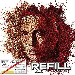 The album cover for Relapse was first published through Eminem's Twitter account on April 21, 2009.[20] It illustrates a head shot of the rapper composed by a mosaic of thousands of pills. A sticker on the cover resembles a prescription drug label, on which the patient is Eminem and the prescribing doctor is Dr. Dre.[20] Gil Kaufman of MTV News described the cover as a reference to the rapper's struggle and addiction to prescription drugs, adding that it follows Eminem's habit of displaying personal issues in his art.[20] The album booklet and back cover follow a pill prescription design. On the backside of the booklet is a dedication to Proof, where Eminem explains that he's sober and that he tried to write a song for him, but that he didn't find one of them good enough therefore he dedicates the whole album to him. The CD itself is meant to represent the lid on a bottle of prescription pills, grey with the big red inscription "Push Down & Turn".[78] The cover for Relapse: Refill is the same, with the background color changed from black to white. The prescription drug label is scratched out and the writing "Refill" is posed next to it.[79]