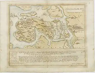 Jerome Tseraarts, governor of Flushing in command of the Dutch forces on the island of Walcheren, had tried to capture Goes shortly before, having been repelled by the garrison of the city, commanded by Isidro Pacheco.[1] On 26 August 1572, in command of 7,000 soldiers[2] among which were 1,500 English under Thomas Morgan and Humphrey Gilbert,[1] and a fleet of 40 ships,[3] Tseraarts returned to besiege the city. The Spanish garrison of Goes, much inferior in number, would not withstand the siege for long without reinforcements.