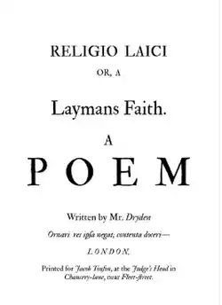 Religio Laici, Or A Layman's Faith (1682) is a poem written in heroic couplets by John Dryden. It was written in response to the publication of an English translation of the Histoire critique due vieux testament by the French cleric Father Richard Simon. Simon's book applied detailed criticism to the textual history of the Bible and argued that, given the compromised nature of much of the Bible, Christians would do better to base their faith on the history and traditions of the Roman Catholic Church.
