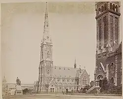 One of the most visible signs of the historical importance of Christianity to Australia is the prominence of churches in most Australian towns and cities. Among Australia's oldest are Ebenezer Chapel and the Anglican St Matthew's, Windsor, St Luke's, Liverpool, St Peter's, Campbelltown and St James Church, Sydney, built between 1819 and 1824 by Governor Macquarie's architect, Francis Greenway.[46] St Mary's Cathedral, Sydney, was built to a design by William Wardell from a foundation stone laid in 1868; the spires of the cathedral were not finally added until the year 2000. Wardell also worked on the design of St Patrick's Cathedral, Melbourne – among the finest examples of ecclesiastical architecture in Australia.[47] The Anglican St Paul's Cathedral, Melbourne, in the iconic hub of the city opposite Flinders Street station. Adelaide is known as the "City of Churches", but churches extend far into the Australian Outback, as at the historic Lutheran Mission Chapel at Hermannsburg, Northern Territory. Along with community attitudes to religion, church architecture changed significantly during the 20th century. Urban churches, such as the Wayside Chapel (1964) in Sydney, differed markedly from traditional ecclesiastical designs. In the later 20th century, distinctly Australian approaches were applied at places such as Jambaroo Benedictine Abbey, where natural materials were chosen to "harmonise with the local environment" and the chapel sanctuary is of glass overlooking rainforest.[48] Similar design principles were applied at Thredbo Ecumenical Chapel built in the Snowy Mountains in 1996.[49]