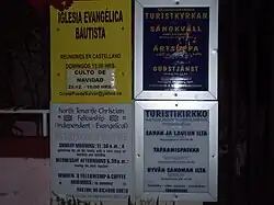 There are also communities of Jehovah's Witnesses and the Church of Jesus Christ of Latter-day Saints,[2] of which there are 3,300 members in the Canary Islands. On the island of Tenerife there are three Latter-day Saint centers: in Santa Cruz de Tenerife, Los Cristianos and San Cristóbal de La Laguna; the latter is the only one in the Canary Islands built expressly as such.[17] On the island of Gran Canaria there are three other centers: Las Palmas de Gran Canaria, Telde, and Vecindario. On other islands there are one on the island of Fuerteventura in Puerto del Rosario and one on the island of Lanzarote in Arrecife. There is also a small group on the island of La Palma.