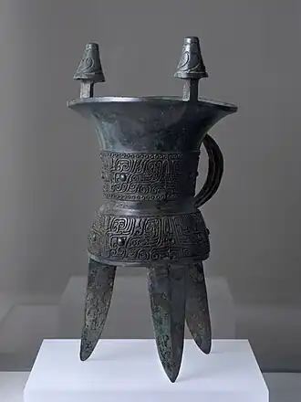 Non-living sacrificial offerings were mainly bones, stones and bronzes. Some of the bone products were shaped into hairpins or arrowheads, and there are instances of ivory found in elite tombs.[176][177] Stone objects such as jade were moulded into decorative ritual objects, such as those discovered in the Tomb of Fu Hao.[178][179] Offering ceremonies involved bronze vessels with short inscriptions, such as the ding (鼎), of which access seemed to be exclusively granted to the king and heirs partaking in rituals.[122][180][181] There were also accepted minor materials like ceramics, the designs on which were inherited from earlier cultures.[182][183]