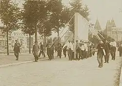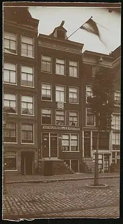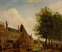 In 1635, Rembrandt and Saskia rented a fashionable lodging with a view of the river Amstel.[18] In 1637, Rembrandt moved upriver to Vlooienburg, in a building on the previous site of the current Stopera.[19] In May 1639 they moved to a recently modernized house in the upscale 'Breestraat' with artists and art dealers; Nicolaes Pickenoy, a portrait painter, was his neighbor. The mortgage to finance the 13,000 guilder purchase would be a cause for later financial difficulties.[b][17] The neighborhood sheltered many immigrants and was becoming the Jewish quarter. It was there that Rembrandt frequently sought his Jewish neighbors to model for his Old Testament scenes.[22] One of the great patrons at the early stages of his career was Amsterdam statesman Andries de Graeff.[23][24]