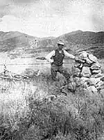 Prior to the construction of Major Carleton's monument, while waiting to rendezvous with the major at Mountain Meadows in 1859, assistant surgeon Charles Brewer was placed in charge of a burial detail by Captain Reuben T. Campbell of Camp Floyd. Brewer gathered the remains of 26 victims, burying them in three mass graves (located one and one-half miles north of where Carleton would construct his monument). Each of these gravesites were marked by a mound of stones.[6][7] Unlike the southern gravesite, the exact location of these graves was lost throughout time.