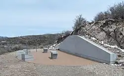 Soon after its construction, the 1999 monument began slipping into the nearby ravine, so during the summer of 2004 a cement retaining wall was constructed by the Church to help stabilize the area.[29] In 2007 a vault toilet was constructed near the monument.[30] The toilet was built by the State of Utah, which continues to maintain it. A 2001 attempt to build a toilet was stalled when a member of the Mountain Meadows Association complained that the association's name would not be included on the restroom.[31]