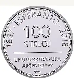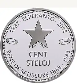 A new silver Esperanto coin for 100 Steloj was struck in 2018 for the 150th birthday of René de Saussure.