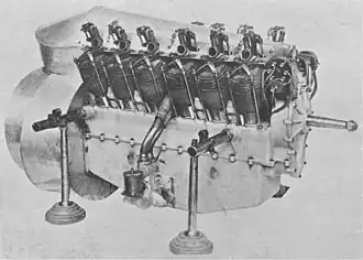 The V-12 engine had its two rows of cylinders angled at 60 degree to each other and had a cylinder bore of 96 mm and a stroke of 140 mm. The cylinders and cylinder heads were separate cast-iron pieces with cast fins for air-cooling. The cylinder head was tightened to the cylinder with a copper-asbestos washer, and then secured by a cross-shaped clamp which was bolted to the crankcase with four long studs.[2] Airflow for cooling the cylinders was generated with a fan driven from the rear end of the crankshaft. The fan was blowing air into the sheet metal enclosed chamber between the two rows of cylinders, which then left the enclosure through the narrow spaces between the cylinders, passing through the cylinder's cooling-fins.