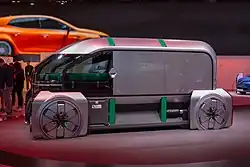 The Renault EZ-GO is an electric robo-taxi concept. It was introduced at the 2018 Geneva Motor Show. The car is powered by an electric motor located on the rear axle. It has a maximum speed limited to 50 km/h (31 mph)[1] and a four-wheel steering to ease urban transit. Its length is about 5,200 mm (200 in)[2] and the passengers (up to six) are in a U-shaped seat row. The glass roof opens from the front and there is a ramp, both features conceived for facilitating access.[3]