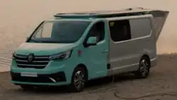 It is based on the Trafic EV and has a two-tone exterior with a roof terrace as the tables and backrests can be installed on the roof. It also has a cabin with linen and wool upholstery. The concept features an adjustable bed measuring 1,950 mm (77 in) long and 1,450 mm (57 in) wide that can be extended behind the vehicle, while "draperies provide privacy and protection from the weather".[1]