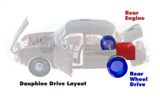 - Engine configuration: Speaking about the Dauphine's rear-engine, rear-wheel-drive layout, Renault's Fernand Picard said in a paper he delivered in 1957 that the car was part of a rear-engine trend led by Volkswagen, Fiat and Renault whereby the rear drive/rear engine configuration had increased from 2.6 percent of continental western Europe's car production in 1946 to 26.6 percent in 1956.[26] The United Kingdom auto industry, which had also managed largely to avoid the front-engine/front-wheel drive trend of the 1930s, was excluded from Picard's figures.[26]