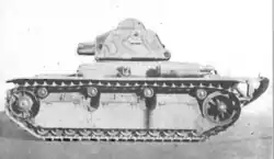 In the late thirties, there had been several projects to improve the Renault R35 light infantry tank. One of these was directed to the improvement of the horizontal rubber spring suspension system that, apart from being less reliable than originally hoped for, caused an uncomfortable ride, high track and tread wear and an unfavourable weight distribution. The type tended to get stuck in soft terrain. Several solutions were proposed, among them an overdrive, new wheel tyres, a freewheel in the gear box, the fitting of grousers or studs on the existing tracks, or the adoption of a new track type. None of these were satisfactory.[1]